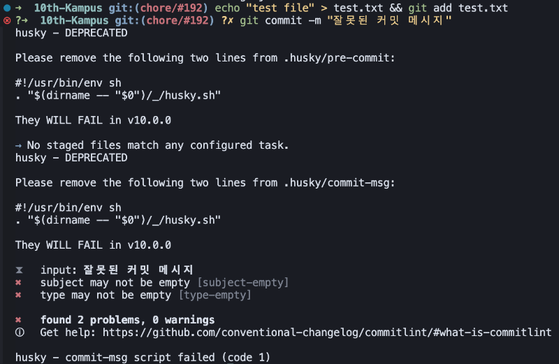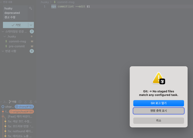 - 규칙에 맞지 않아, 문제가 발생한 경우: 올바른 형식을 알려주며 커밋이 중단
