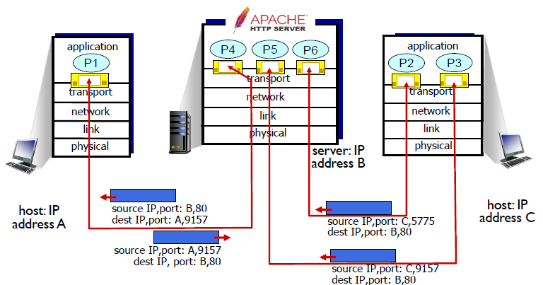 receiver은 4가지 정보를 가지고 세그먼트를 적절한 소켓에 전송. 포트넘버도 사용해 정확한 프로세스를 식별함